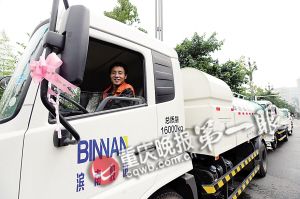 這次婚車(chē)創(chuàng)意,并不出自新人和婚慶公司,而是來(lái)自新娘的公司。這家民營(yíng)企業(yè)承包了南濱路的道路保潔,這12輛灑水車(chē)是公司去年剛購(gòu)置的,發(fā)喜糖時(shí),公司老總突發(fā)奇想,要用公司的灑水車(chē)緊跟婚車(chē)隊(duì)伍,表示祝福。